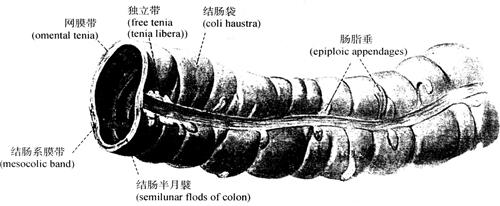 | 释义 | 大肠 大肠(1arge intestine)是消化管的末段,起于右髂窝回盲口(ileocecal orifice),而终于肛门,全长约1.5m。分盲肠(cecum)、结肠(colon)、直肠(rectum)和肛管(anal canal)四部分(图9-18)。大肠主要功能是吸收水分,分泌黏液并把食物残渣形成粪便排出体外。大肠口径较粗,除直肠、肛管外,在结肠和盲肠具有三种特征结构区别于小肠:①结肠带(colic bands,taenia coli),由三条纵行肌增厚而成。②结肠袋(haustra of colon)由于结肠带较肠管短,使肠管形成很多由横沟隔开的囊袋状突出,称为结肠袋。③肠脂垂(epiploic appendices):结肠带附近有许多脂肪突起,称肠脂垂。此外在肠壁内面,相当于结肠袋之间横沟处环行肌增厚,黏膜也向肠腔内突起形成许多皱襞称结肠半月襞(semilunar folds of colon)(图9-25)。此外,小儿特别是小婴儿,结肠肠壁相对较薄,且无明显的结肠带与肠脂垂;升、降结肠及直肠与腹后壁固定也较差等等。这些小婴儿结构上的特点,是婴儿容易发生肠套叠(intussusception)的解剖学因素之一;也是乙状结肠和直肠部位成为直肠脱垂(proctop toma)的发病因素。