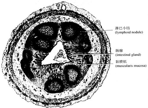 图9-26 盲肠与阑尾 2.阑尾(vermiform appendix) 为一条形似蚯蚓状的盲管,故也被称蚓突(vermiform process)(图9-26)。阑尾根部连于该口,远端游离,一般长约6~8cm,外径介于0.5~1.0cm之间。儿童的阑尾与其身高相比,相对较成人为长。中年以后逐渐萎缩变小。阑尾的位置变化很大,中国人体调查统计,以回肠前位最多见,占28%;其次是盆位和盲肠后位,分别占26%和24%。三条结肠带较恒定的汇合于阑尾根部,临床阑尾手术时,可沿结肠带向下寻找阑尾。阑尾根部的位置比较固定,其体表投影位于右髂前上棘与脐连线的中、外1/3交点处,称McBurney点。急性阑尾发作时,此点腹壁附近有明显压痛,对诊断阑尾炎具有一定的参考价值。阑尾的组织结构与大肠相似,其最显着的特征是固有层有大量淋巴小结,它们互相融合并伸入黏膜下层,使黏膜肌层不完整(图9-27)。
