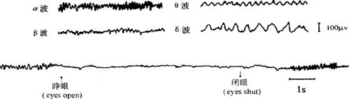 | 释义 | 大脑皮质的电活动 大脑皮质神经细胞在无特殊外来刺激的情况下,自身具有的持续节律性的电位变化称为自发电位(spontaneous potential);在外加刺激引起感觉传入冲动的激发下,也可以在大脑皮质的一定区域产生较为局限的电位变化,则称皮质诱发电位(evoked potential)。前者用脑电图仪(electroencephalograph)的引导电极安放在头皮表面即可记录到皮质自发电活动波,称为脑电图(electroencephalogram,EEG)。 (一)正常脑电图 在觉醒、困倦、睡眠等不同状态下,脑电图的波形、频率有明显的差别。正常脑电图可根据其波幅、频率的区别分为以下四种波型:α、β、θ、δ(图12-115)。