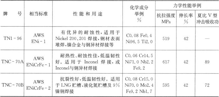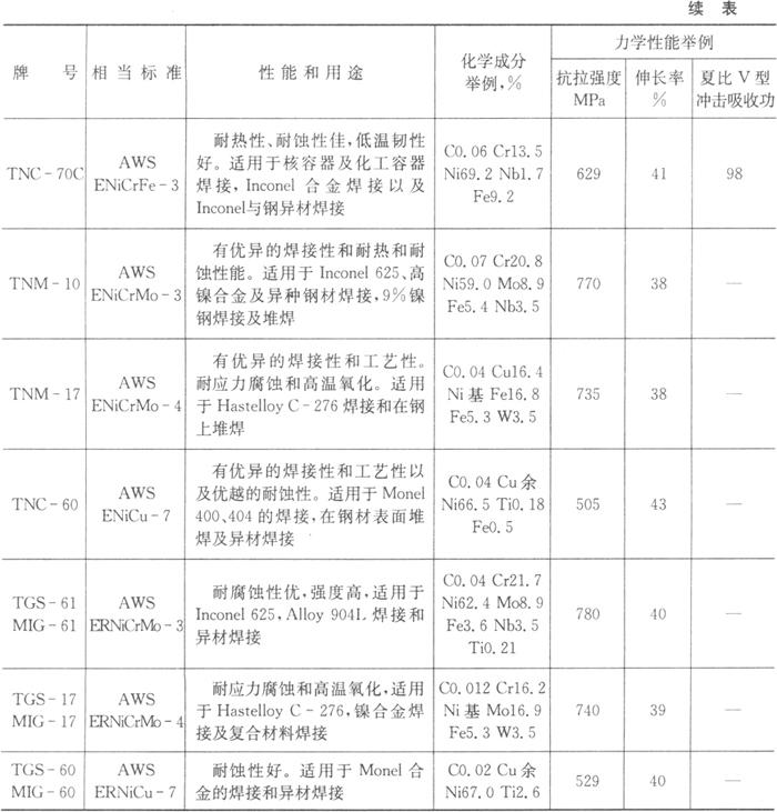 天泰焊材(昆山)有限公司生产的主要镍及镍合金焊条性能及用途见表5.7-9。