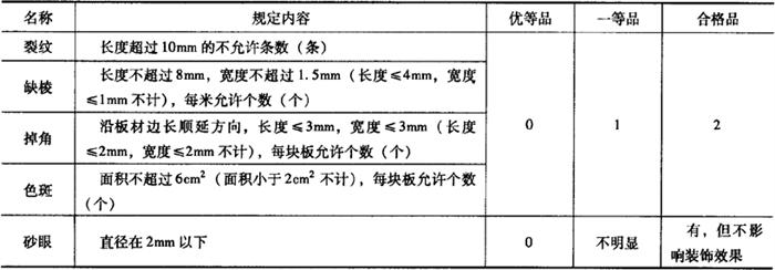 (五)外观质量 同一批板材的花纹色调应基本相同。将板材平放在地面上,距板材1.5m处明显可见的缺陷视为有缺陷;距板材1.5m处不明显但在1.0m处可见缺陷视为无明显缺陷;距板材1.0m处看不见的缺陷视为无缺陷。缺棱掉角为0.5mm的用钢直尺测量其长度和宽度。板材正面的外观缺陷应符合表15-6中的规定。 表15-6 大理石板材正面的外观缺陷要求