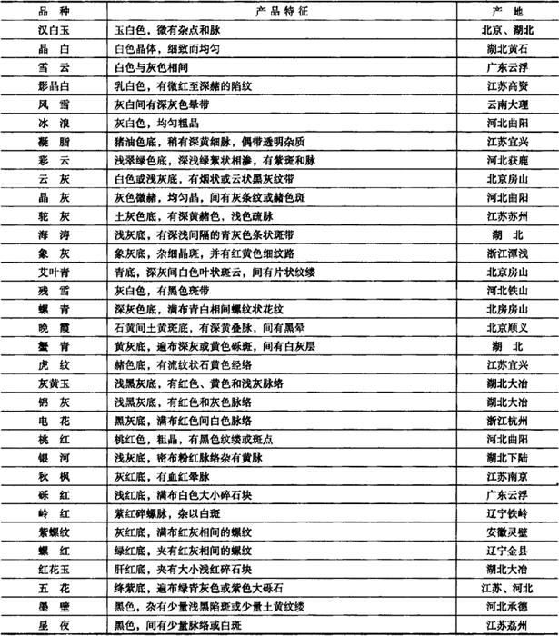 注:表中未包括的板材,其镜面光泽度由供需双方商定。 (七)出厂检验 作为建筑装饰用的大理石饰面板材,对其强度、体积密度、吸水率及耐磨性等,在一般情况下不进行检验,也不作具体规定,而以其外观质量、光泽度及颜色花纹等作为主要评价和选择的指标。 1.检验项目 对于大理石板材检验的主要项目有:规格尺寸偏差、平面度极限公差、角度极限公差、外观质量和镜面光泽度。 2.组批规定 同一品种、等级、规格的大理石板材以100m为一批;不足100m的按单一工程部位为一批。 3.抽样数量 板材规格尺寸、平面度、角度、外观质量的检验,应从同一批板材中随机抽样5%,数量不足10块的,应抽足10块。镜面光泽度的检验,应从以上抽取的板材中抽取5块进行检验。 4.等级判定 单块板材的所有检验结果,如果均符合技术要求中相应等级时,判定为该等级。我国有关标准规定,在同一批板材中:优等品中不得有超过5%的一等品;一等品中不得有超过10%的合格品;合格品中不得有超过10%的不合格品;各等级的光泽度不得低于表15-7中规定数据的95%。 检验结果不符合要求时,应该加倍抽样检验。如仍不符合要求,则判定该批板材的质量不符合该等级。 (八)国产大理石品种 我国大理石蕴藏量极为丰富,花色品种也很多。国内大理石板材的生产厂家遍及全国各地,主要分布在云南大理、北京房山、湖北大冶、河北曲阳、湖北黄石、山东平度、广东云浮、安徽灵壁、山东莱阳、广西桂林、安徽怀宁、浙江杭州、辽宁铁岭、河北铁山、江苏南京、河北获鹿、江苏苏州等24个地区。天然大理石的品种,以磨光后所呈现的花纹、色泽、特征及厚料产地来命名,常用品种及特征如表15-8所示。 表15-8 常用大理石板材的品种