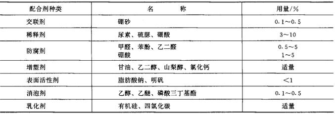 2.常用配合剂 淀粉胶粘剂中常用的配合剂有:交联剂(如硼砂,以增加粘度,提高耐水性),稀释剂(如尿素,使分子解聚,以调节适宜的粘度)等。配合剂的种类与用量详见表5-5-4。 表5-5-4 配合剂的种类与用量