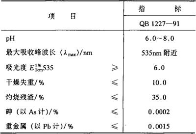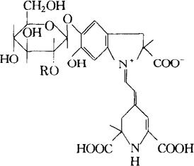 (Ⅰ)R=β-D-吡喃葡萄糖基糖醛酸 C30H34O19N2 相对分子质量 726(苋菜苷,Amaranthin) (Ⅱ)R=H C24H26O13N2 相对分子质量 550.48(甜菜苷,Betanine) 性状 紫红色无定形干燥粉末,易吸湿,易溶于水和稀乙醇溶液。溶液在pH小于7时呈紫红色,澄明,不溶于无水乙醇、石油醚等有机溶剂。对光、热的稳定性较差,铜、铁等金属离子对其稳定性有负影响。pH大于9.0时,本品溶液由紫红色转变为黄色。 制法 以红苋菜(Amaranthus tricolor L.)可食部分为原料,经水提取、乙醇精制获得的浓缩液。通过干燥处理,即可获得紫红色干燥粉末状成品。 质量标准