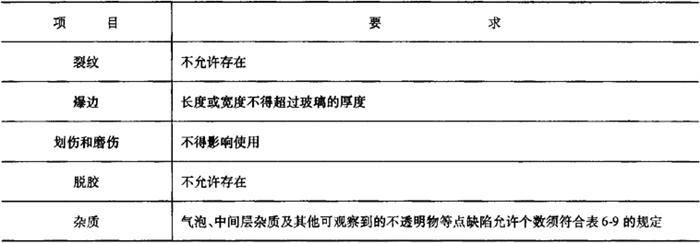 3.要求 (1)材料 1)浮法玻璃、压花玻璃、夹丝网玻璃、夹线玻璃、钢化玻璃、吸热玻璃、半钢化玻璃等应符合相应的规范要求。 Ⅲ类夹层玻璃不使用夹丝玻璃及钢化玻璃。 2)聚碳酸酯板、聚氨酯板、丙烯酸酯板等塑料材料应符合相应标准、技术条件或订货文件的要求。 3)聚乙烯缩丁醛等中间层材料应符合相应标准、技术条件或订货文件的要求。 (2)外观质量(表6-8) 表6-8 夹层玻璃的外观质量要求