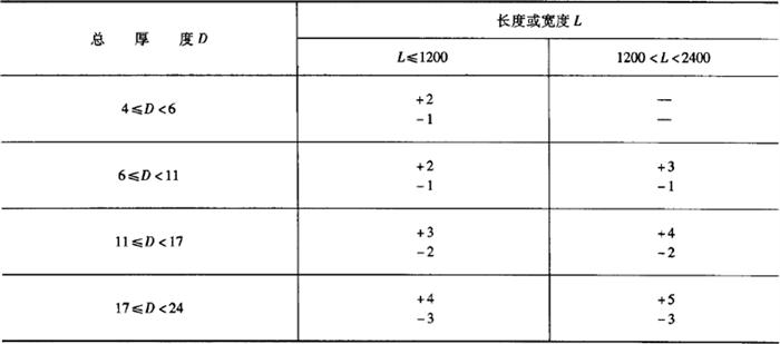 注:1.小于0.5mm的缺陷不予以考虑,不允许出现大于3mm的缺陷。 2.当出现下列情况之一时,视为密集存在: a)两层玻璃时,出现4个或4个以上的缺陷,且彼此相距不到200mm; b)三层玻璃时,出现4个或4个以上的缺陷,且彼此相距不到180mm; c)四层玻璃时,出现4个或4个以上的缺陷,且彼此相距不到150mm; d)五层以上玻璃时,出现4个或4个以上的缺陷,且彼此相距不到100mm。 (3)尺寸允许偏差 1)长度与宽度 平面夹层玻璃长度及宽度的允许偏差应符合表6-10的规定。 表6-10 夹层玻璃长度及宽度的允许偏差mm