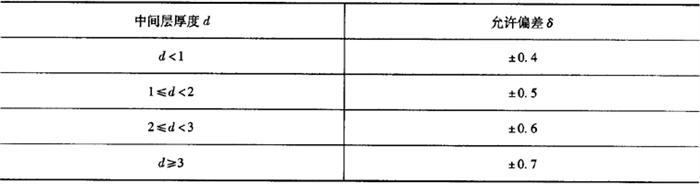 3)厚度 对于多层制品、原片玻璃总厚度超过24mm及使用钢化玻璃作为原片时,其厚度允许偏差由供需双方商定。 ①干法夹层玻璃的厚度偏差 干法夹层玻璃的厚度偏差不能超过构成夹层玻璃的原片允许偏差和中间层允许偏差之和。中间层总厚度小于2mm时,其允许偏差不予考虑。中间层总厚度大于2mm时,其允许偏差为±0.2mm。 ②湿法夹层玻璃的厚度偏差不能超过构成夹层玻璃的原片允许偏差与中间层的允许偏差之和。 中间层的允许偏差见表6-12。 ③对矩形夹层玻璃制品,一边长度小于2400mm时,其对角线偏差不得大于4mm,一边长度大于2400mm时,其对角线偏差由供需双方商定。 表6-12 湿法夹层玻璃-中间层的允许偏差mm