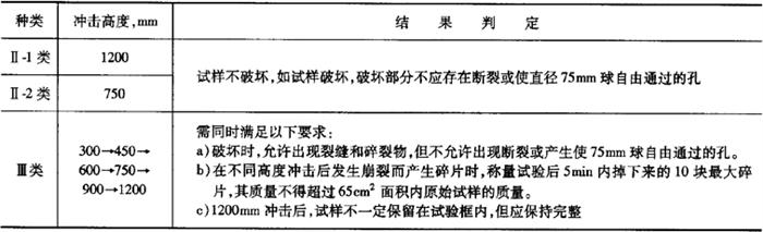 式中 △T——可见光透射比相对减少率,%; T1——紫外线照射前的可见光透射比; T2——紫外线照射后的可见光透射比。 使用压花玻璃作原片的夹层玻璃对可见光透射比不作要求。 (8)落球冲击剥离性能 试验后中间层不得断裂或不得因碎片的剥落而暴露。 钢化夹层玻璃、弯夹层玻璃、总厚度超过16mm的夹层玻璃及原片在三片或三片以上的夹层玻璃由供需双方商定。 (9)霰弹袋冲击性能(表6-13) 表6-13 霰弹袋冲击性能