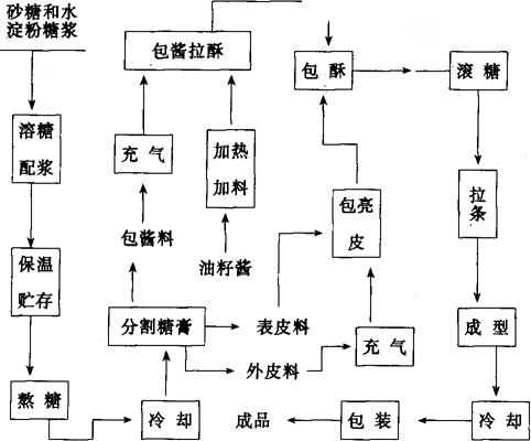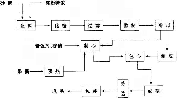 图1-11-12 酥心夹心糖加工工艺流程 酥心糖是以硬糖膏为外皮,以酱体为酥心体制成的糖果。其加工工艺如图1-11-12所示。熬糖糖膏必须进行高浓度熬煮,使硬糖坯的含水量在2%以下,以保持硬糖应有的硬、亮、脆、透明的特点。若为真空连续熬糖则要求真空度91~99kPa,蒸汽压力490~588kPa,糖体内糖浆温度136~142℃。若为明火熬糖,则要求火度平稳,140℃以下熬糖锅加盖,140℃以上要求及时转锅。出锅温度为162~165℃。 酥心糖的成型与多数熬煮糖果的糖坯相同,在70~85℃时具有最大可塑性的情况下进行模压、切割、成型。糖果的包装必须是裸体糖果进行充分的冷却。在等于或高于室温1~2℃时方可进行包装。 2.2 果酱夹心糖加工工艺流程(图1-11-13)