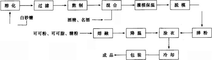 图1-11-13 果酱夹心糖加工工艺流程 果酱夹心糖含水量较高,一般达20%左右。在制作、贮存过程中,往往会由内向外而逐渐溶化,造成穿孔流酱,所以制作难度较大,且不宜长时间贮藏。其加工工艺如图1-11-13所示。其糖坯是按硬糖的熬制程序制取糖坯。 在制心时注意,制心时取硬糖坯三分之一,趁热压成平块状,对合折叠成扁口袋形。然后将预热的果酱注入,封牢开口处制成袋装馅心。因内馅含水量较高,外衣硬糖逐渐溶化,所以内馅的含水量必须控制在20%以下。因此,上面所提制心口袋状硬糖衣不能省略。包馅时硬糖坯外皮必须厚薄均匀,内馅、外皮的温度差异不宜过大,保证成型后,果酱不能外溢。 2.3 酒心巧克力夹心糖加工工艺流程(图1-11-14)