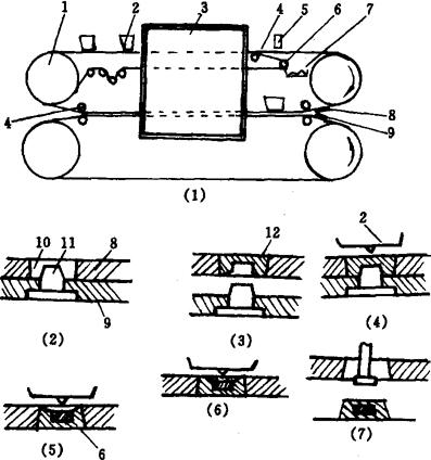 图1-1-14 酒心巧克力夹心糖加工工艺流程 酒心巧克力夹心糖是将酒与糖品有机地结合在一起,其加工工艺如图1-11-14所示。 酒心巧克力夹心糖主要是利用饱和状态的糖、酒混合物的结晶原理,使糖粒的外表结成一层硬性糖壳,自然地成为浆液的保护层,周围再涂上巧克力外衣。使酒心巧克力具有固体般的形态,且可延长有效保质时间,便于运输和贮存。在灌模时注意糖浆流量要缓慢而均匀,要趁热一次灌完,防止糖浆的温度降低而造成返砂。保温过程中应让糖浆自然冷却,否则会产生粗粒状结晶,容易破碎。涂衣的巧克力浆温度应控制在30~33℃范围内,浆料温度过高,往往会导致糖坯的软化,以糖坯温度略低于浆料温度为好。另外,涂衣干燥后的糖块必须迅速冷却,其温度一般控制在7~15℃。 3 关键设备 有关熬糖设备、保温辊床、拉条机参见第1篇第11章第1节。 3.1 充气机 为了保证酥心糖的甜、酥、脆特性,在生产过程中除一层表皮要求透明以外,对其余大部分硬糖进行充气处理,又称拉白。充气机主要由2个转臂、1只静臂、工作台及传动装置组成。 充气机工作原理:将经高温熬煮的糖膏冷却后,留出一部分做为亮皮使用,剩余大部分经充气机静臂和转臂上进行充气处理。在传动装置的带动下2支转臂相向交叉旋转,大量空气被裹夹到糖坯中,此时糖坯相对密度减轻,内部组织疏松。经过充气处理增加了糖坯的弹性,从而有利于酥心糖的成形。 3.2 成型机 酥心糖的成型主要有模挤或冲压成型和浇模成型。冲压成型机参见第1篇第11章第1节。这里将着重介绍浇模成型。 浇模成型机的组成如图1-11-15所示。 该机环形链条携带着许多冲有呈喇叭口型模孔的上模盘,且模孔的嘈叭向上。当上模盘被传送至糖料斗2前的小滚轮时,与装置着许多型芯11的上模盘8汇合重叠。型芯上端呈锥型,并伸进模孔中,形成夹心糖果的浇模[图1-11-15(2)]。