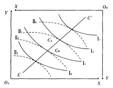 又称埃奇沃思盒状图(Edgeworth Box Diagram),用以分析在一定资源条件下,两种经济活动交互作用的一种矩形图,由英国经济学家埃奇沃思(F.Y.Edgeworth)首先提出。原来埃奇沃思将它应用于消费领域,分析消费过程和消费活动的情况,称为交换矩形图;后来一些经济学家将它应用于生产领域,用以分析研究资源配置问题,称为生产矩形图。消费契约曲线是反映交换最优条件的一条曲线,它旨在说明两个消费者在不同的收入-价格情况下,如何从商品的选择中达到均衡。契约曲线如图所示。假定有A、B两人,有X、Y两种商品,图中,以OA为A的原点,横轴OAX表示商品X的数量,纵轴OAY表示商品Y的数量。再以OB为B的原点,横轴OBX、纵轴OBY的含义同前。图中的各条曲线就是对于A或B的无差异曲线,表示商品X和Y的许多不同的组合。连接两组无差异曲线切点轨迹的CC′曲线,即契约曲线。契约曲线上的任何一点都是两人两商品交换的帕累托最优点,这条曲线上的所有点所代表的商品组合对交换双方都具有相等的边际替代率,因而都是交换均衡点,而整个曲线也就是均衡交换线。消费契约曲线又被称为帕累托集(Pareto Set)。