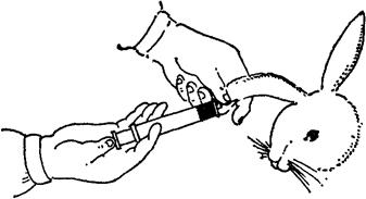 图3-15 小白鼠颅内注射法 九、鼻内接种法 根据接种病原微生物的种毒,必要时动物需先用乙醚麻醉。大动物用麻醉口罩进行麻醉,小动物可放于有盖的玻璃缸内,缸内放浸有乙醚的脱脂棉,使动物达到麻醉。动物麻醉后,用滴管将接种材料慢慢滴入鼻内。如动物处于深麻状态,则能将接种材料吸入肺内。深麻醉的动物易发生肺水肿,大部分在接种后一天内死亡。还需注意,轻度麻醉的动物企图将接种材料喷出。因此进行此项接种时,术者应戴口罩并隔保护玻璃操作、鼠内接种量不可过大,小鼠接种量为0.03~0.05ml,家兔可达2ml。 |