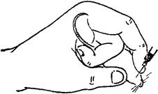 图3-11 小白鼠腹部皮下注射法 四、肌肉注射法 选择肌肉丰满,无大血管通过处。禽类注射部位为胸肌,其他动物为臀部。 五、皮内注射法 将注部剪毛,若需观察注部反应,则勿用碘酒消毒,可用酒精消毒。皮内注射部位的皮肤不可过于紧张。给小动物注腹部;羊在尾根皱褶处或股内侧;牛、马在颈部。术者用左手将注部皮肤夹起成一皱褶,再将针头刺入皮层,然后缓缓注入。如确注入皮内,则注射时感觉有阻力,注部形成突起的小包。皮内注射量一般为0.1~0.2ml。 六、腹腔内注射法 禽类注射部位在胸骨脊的后缘两侧。注射小动物时,可将其固定倒提使肠管前移,以免刺伤肠管。注射家兔及豚鼠时先将针头在腹股沟处刺入皮下,前进少许,再刺入腹腔而注射,注射量可达5ml。给小白鼠腹腔注射,先用右手提鼠尾,将小白鼠放于铁丝网上,然后用左手食指和拇指捏住鼠的两耳和头部皮肤,再将鼠尾夹于左手的无名指和手掌之间,则鼠的腹部向上,并使其头向下(图3-12),右手持注射器,将针头先平行刺入皮下,然后向下斜行通过腹部肌肉而入腹腔。注射量为0.5~1ml。给各种动物腹腔内注射时,若无把握针头是否位于腹腔内或误刺入肠管及其他管道,则可将注射器先抽吸一下,若无肠内容物或其他液体吸入注射器中,且抽吸时觉有负压,则表明针头确在腹腔中而非在肠道或其它管道中,此时即可注射。