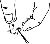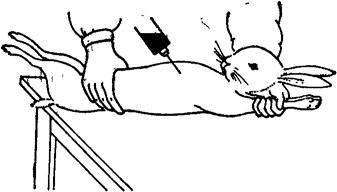 图3-16 小白鼠后眼眶静脉丛取血法 眼眶动脉和静脉采血法:用左手抓住鼠,拇指和食指尽量将鼠头部皮肤捏紧,使鼠眼球突出。右手取一无钩弯小镊,在鼠右侧眼球根部将眼球摘去,并将鼠倒置,头向下,此时眼眶内很快流血。此法一般约可取出4~5%鼠体重的血液量。 左前肢腋窝下采血:将白鼠麻醉后,腹部向上固定于固定板上。体表消毒后,将左胸皮肤剪开,并将皮肤与肌肉剥离,向左前肢展开而成一袋状,用消毒剪将左前肢腋下静脉剪开,用毛细吸管吸取流出的血液。此法可获得较多的血液。 三、豚鼠采血法 心脏采血:与家兔心脏采血基本相同。700克的豚鼠一次可采血10ml左右,隔2~3周可再采血。 耳缘采血:取少量血液,可剪破耳缘任其自然流出。 颈动脉放血:与家兔相同。 四、家兔采血法 耳缘静脉采血:获得少量血液可从耳缘静脉采取。助手将耳缘静脉的近心端按紧,术者用粗针头刺破静脉,此时按住血管的手仍不可放松,用试管接流出的血液。此法可采血2~5ml。 心脏采血:助手以左手各指分别将家兔的两耳及两前肢一起夹住,使两前肢拉向家兔的头后并靠于左手掌上,右手卡住家兔的腰部,使家兔仰卧于靠近桌角的桌边上。术者站于桌角的右旁进行采血(图3-17)。术者以食指摸着锁骨,以拇指摸着剑突作为标志;此两标志的中点即为进针处,也可用左手指触摸心脏跳动处为进针处。针头刺入2~3cm,由于心搏力量,血液自然进入注射器。切忌猛烈抽吸或使针头在胸腔内左右摆动,引起内出血。采血后,不让兔挣扎,放回笼中。2000g以上的家兔一次可采血20~30ml,隔2~3周后可再采血。