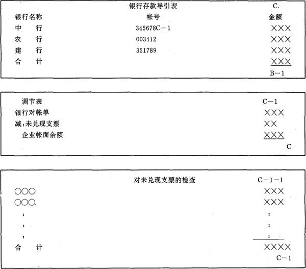 (4)审计工作小结。 (5)总体审计计划。 (6)管理建议书。 (7)其他。如审计业务约定书、对被审单位的内部制度的评价,时间、费用预算等。 2.业务类工作底稿。 该类工作底稿是指注册会计师在审计程序及其实施过程中所编制的工作底稿。这类工作底稿主要包括对会计报表实施具体程序的记录和资料以及执行分析性复核的记录和资料,它包含实施审计阶段所收集的全部审计证据,如现金的清点记录、存货的盘点记录、应收帐款的函证情况等等。这类工作底稿为出具审计报告提供基础。 这类工作底稿包括的内容及其排列顺序取决于不同会计师事务所所采用的不同的审计模式。即按报表项目进行审计,还是按经济业务的循环进行审计。 按会计报表项目进行审计的程序是先审计资产负债表,其次是损益表、财务状况变动表以及其他表。审计每一张报表时,应按报表要素的顺序进行。因此,工作底稿的归类参照审计程序的先后合理放置。 按经济业务的循环审计是指将企业的经济业务分成不同的循环,如:销售循环、生产和服务循环、财务循环以及管理循环等。注册会计师以不同循环为核心进行审计,因此,注册会计师在审计时,对所收集的工作底稿也要按照各循环归类。 一般来说,按会计报表项目进行审计,使审计工作全面而不易漏项,但容易重复。目前我国绝大多数的会计师事务所采用这种方法。按经济业务循环进行审计时,审计工作不重复,但易漏项。 3.综合类工作底稿。 该类工作底稿是指注册会计师在审计过程中取得的,对以后年度的审计工作具有备查作用的工作底稿。如被审计单位设立的有关法律文件;企业批准设立的证书、营业执照、合同、协议、章程等文件及其变更文件的复印件;被审计单位组织结构及管理人员结构等相关资料等等。 (二)工作底稿按使用期间的长短又可分为永久性档案和一般档案。 注册会计师在审计工作中应对其所收集的工作底稿进行分类整理,形成审计档案 1.永久性档案。 永久性档案是指那些记录内容稳定,具有长期使用价值,并对以后审计工作具有重要影响和直接作用的审计工作底稿。它一般包括: (1)客户经营资料和经营展望,客户行业的财务资料; (2)主要协议、合同、公司章程、联营合同、营业执照; (3)长期经营策略及预算; (4)长期审计计划,如不同年度的审计计划,有关存货盘点地点计划等; (5)向客户提供的管理建议书以及审计报告的附本等等。 永久使用的工作底稿并非一成不变,它应每年进行更新,将过期无效的文件取出,并增加有关的新资料。 2.一般档案。 它是指那些内容经常变化,只供当期使用和下期参考的审计工作底稿。业务类工作底稿一般来说就属于这一类档案。 三、工作底稿的编制和索引 (一)工作底稿的基本要求 对编制工作底稿的基本要求是:要素齐全,格式规范,标示一致,记录清晰,结论明确。 1.“格式规范”是指工作底稿既要符合独立审计准则的有关要求,也要符合会计师事务所内部制度的规定。一个好的会计师事务所都应有自己内部规范的工作底稿格式,以便于审核、培训新职员以及材料的装订。注册会计师编制的审计工作底稿应包括以下基本要素:被审计单位名称标示及其说明、具体审计事项的名称、审计项目的时点和期间、审计过程记录、审计标示及其说明、审计结论、索引号及页次、编制者及复核者的姓名、日期等等。工作底稿的通用格式参见如下(见表3-3): 表3-3