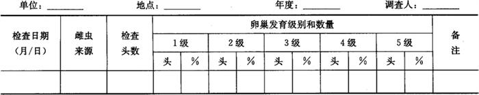 2.1.2 灯光诱测 结合其他害虫进行诱测。从越冬代成虫起,到末代成虫终止期止。结果记入小地老虎成虫诱测记载表(表3-43)。 2.2 雌蛾发育进度调查 从早春诱到越冬代成虫开始到成虫末期,每3天检查1次,每次抽查20头,不足20头时全部检查。将结果记入小地老虎雌蛾卵巢发育进度检查记载表(表3-44)。 表3-44 小地老虎雌蛾卵巢发育进度检查记载表