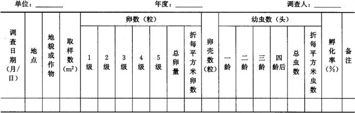 2.3 卵和幼虫调查 2.3.1 发育进度系统调查 为掌握卵和幼虫的发生消长动态,根据当地种植情况,选杂草较多、常年发生较重的春播作物田1~2块,从越冬代成虫始盛期起到产卵末期止,每3天调查1次。调查取样方法,因产卵环境和空间分布情况不同,可采用按单位面积取点或查当地主要寄主植物的方法。黄淮海发生区,每次每块地查5点,每点1m2,检查点内土面、枯根须、草秆上的卵粒,杂草或作物叶反面卵虫或心叶内以及钻进植株根标松土里的幼虫。幼虫分龄期,并分别统计卵孵化率、各级卵和各龄幼虫百分率。结果记入小地老虎田间卵和幼虫量调查表(表3-45)。 表3-45 小地老虎田间卵和幼虫量调查表