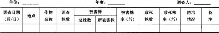 2.3.2 发生量大田普查 根据发育进度系统调查情况,在卵盛孵期(卵已变红至灰黑色)至一、二龄幼虫盛期,选择不同地势、土质、土壤湿度、作物种植和杂草密度等类型田各2~3块,调查取样方法同系统调查。结果记入小地老虎田间卵和幼虫量调查表(表3-45)。 2.4 为害情况调查 在一代幼虫开始化蛹、基本上结束为害以后,分别选不同作物及防治与未防治等类型,选择代表性地块进行为害情况调查。每块地随机取5点,棉花、玉米、高粱等作物每点40株,共调查200株;谷子、黍稷等条播密植作物每点调查10m单行,共50m行长(取点测算总株数),调查受害株数和致死株数。将结果记入小地老虎为害情况调查表(表3-46)。 表3-46 小地老虎为害情况调查表