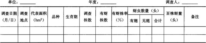 注:地块类型是指早、中、晚播田或高肥水田等。 2.2 大田普查 2.2.1 普查时间 在小麦秋苗期、拔节期、孕穗期、抽穗扬花期、灌浆期进行5次普查。同一地区每年调查时间应大致相同。 2.2.2 普查田块 根据当地栽培情况,选择有代表性的麦田10块以上。 2.2.3 普查方法 每块田单对角线5点取样,秋苗期和拔节期每点调查50株,孕穗期、抽穗扬花期和灌浆期每点调查20株,调查有蚜株数和有翅、无翅蚜量,记录结果并汇入小麦蚜虫大田普查表4-131。 表4-131 小麦蚜虫大田普查表
