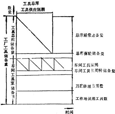 通常分车间工具周转储备量和库房工具周转储备量。车间周转储备量包括工地占用量、修理占用量、车间工具室流动储备量和保险储备量;库房工具周转储备量包括流动储备量和保险储备量。目前常用的工具储备量的构成如图4-2。