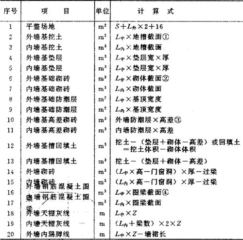 | 释义 | 工程量计算统筹式 工程量计算统筹式中: S-底层建筑面积; L中-外墙中心线; L内-内墙净长线; L外-外墙外边线; Z-层数。 表2-40 工程量计算统筹式表