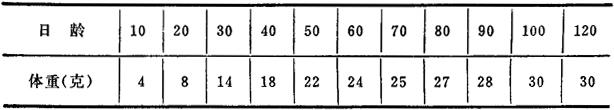 图3-1 养鼠罐 小白鼠和金黄地鼠的混合精饲料配方和料块制法如下。 麸皮100、豆饼250、高粱110、面粉250、玉米面189、鱼粉50、骨粉25、食盐10、酵母粉16、鱼肝油按1%,以上总计1000。混合料粉制成面团,切块,烘干,存干燥通风处。料块最好每周制作一次,冬季可保存一个月。北方保存时间较长。 表3-1 小白鼠的日龄与体重的关系