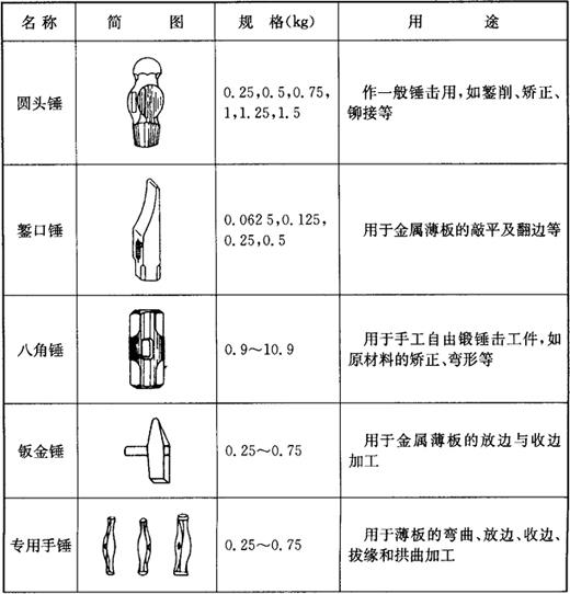 | 释义 | 常用工具 钣金制作中常用的工具按其功能分为锤类工具、划线工具、风动工具、电动工具和起重工具等若干大类。 锤类工具分为钣金锤、钳工锤和大锤等几种。其规格和用途见表5-2。 表5-2 锤类工具
