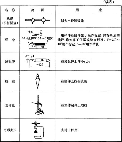 划线工具包括划针、划规、样冲、划针盘及弓形夹头等,详见表5-3。 表5-3 划线工具