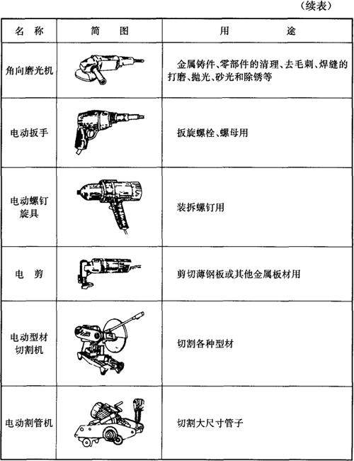 电动工具有电钻、电动扳手、电剪、电动型材切割机及角向磨光机等,见表5-5。 表5-5 电动工具