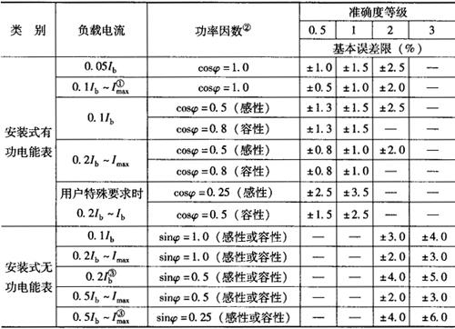 注:①不平衡负载是指在对称的三相电压下,电能表任一电流线路有电流,其余电流线路无电流; ②功率因数角θ是指加在有电流那一组元件上的电流与电压间的相位差。 ②在检定周期内,电能表的基本误差值不得超过表7-13至表7-14的规定。标准电能表在检定周期内基本误差改变量的绝对值不得超过基本误差限的绝对值。 表7-13 单相和三相(平衡负载)安装式电能表的基本误差限