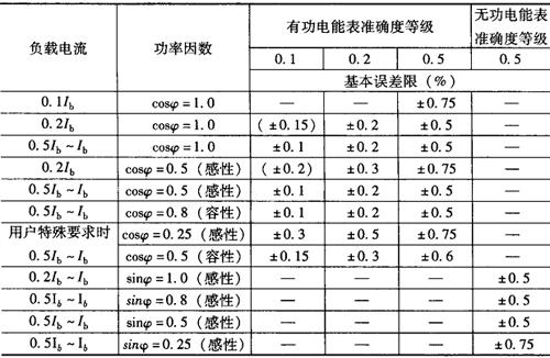 注:周期检定时允许将cosφ=0.8和sinφ=0.8,改成cosφ=0.866和sinφ=0.866。对0.1级携带式有功电能表,括号内误差仅供参考。 表7-7 不平衡负载时携带式三相有功和无功电能表的基本误差限