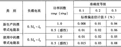 注:cosθ和sinθ跟表7-5中的注②相同。 ③在额定频率和额定电压的条件下,携带式电能表对同一电能值不少于5次的重复测量(每次测量不需重新起动电压电流调节设备),由此求得评定测量精度(重复性)的标准偏差估计值S(%),应不超过表7-8规定。 表7-8 携带式电能表重复测量结果的标准偏差估计值