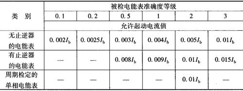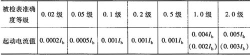 注:携带式电能表按恒定负载运行时,允许负载电流为0.8Ib~Ib (3)起动:在额定电压、额定频率和cosφ=1.0(对有功电能表)或sinφ=1.0(对无功电能表)的条件下,负载电流不超过表7-9规定时,电能表转盘应连续转动。 表7-9 允许起动电流值
