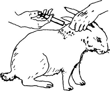 | 释义 | 常用的家兔给药方法 因为药物的作用不同、产生效果的快慢不同和家兔的大小不同,则应采取不同的给药途径。 1.口服给药 此法操作简便,适用于多种药物,尤其是治疗消化道疾病的药物。缺点是药物易受肠胃内环境的影响,药量不易掌握,吸收不完全,效果慢。 (1)自由采食法:多用于大群预防性给药或驱虫,适用于无不良气味的药物,且病情较轻、尚有食欲的家兔。方法是混合在饲料中或撒在饲料表面,让家兔自由采食。 (2)投服法:适用于有异味的片剂药物和废食的家兔。方法是助手保定家兔,固定兔头,掰开兔嘴,将药投入口中,使其吞咽。或研成粉末,将药装入药管,掰开口将药管轻轻放入咽喉,轻弹药管,将药撒入让其咽下。 (3)灌服法:适用于有异味的药物和已废食的家兔。方法是将药片研成末溶化于水,吸入注射器或胶管,从兔嘴角插于口中,徐徐注入让其咽下。 2.直肠灌药法 常用于发生便秘和毛球病时,内服给药效果不好,可用直肠灌注法。方法是将兔侧卧保定,后躯稍高,用涂有润滑油的塑料管从肛门插入直肠5~8厘米,用注射器将药液注入直肠。但注意适当将药液加热至30~40℃,注后并捏住肛门停留三五分钟后再将兔放开,即可排便。 3.注射给药法 注射给药吸收快,奏效快,安全,节省药物。但需注意药物的质量及注射器、针头、皮肤的严格消毒。 (1)皮下注射法(图10):多在颈部、肩前、股内侧和腹下皮肤松弛易移动的部位。方法是用拇指、食指和中指将皮肤捏起呈三角形,右手用注射器将针头刺于三角形基部,将药液注入。注射前应当剪毛,用酒精或碘酊严格消毒。皮下注射多用于有说明要求的疫苗。
