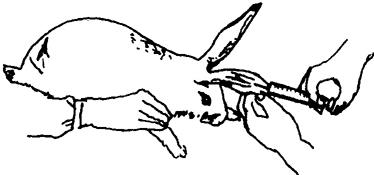 图10 皮下注射方法 (2)肌肉注射法:选择肌肉丰满的颈部、臀部、大腿内侧,用酒精或碘酊严格消毒,将针头迅速刺入肌肉,抽动注射器活塞,无回血时即可将药液徐徐注入。拔出针头并用酒精棉球按压片刻。 (3)静脉注射法(图11):注射部位多在耳外缘静脉,先保定家兔,用酒精在注射部位严格消毒,左手固定兔耳,用食指和中指夹住静脉管,使其怒张,右手持注射器,针头斜面朝上,从血管刺入,抽动注射器活塞,若见回血,则表示注射准确,即可将药液慢慢注入,若不见回血,要重新刺,注射完毕后,用酒精棉球按住针头轻轻拔下停留片刻,防止出血。注意静脉注射时要将注射器内空气排净,药液适当加温,特别是寒冷季节更应注意。注射时还要慢慢注入,不可像肌肉注射那样快。