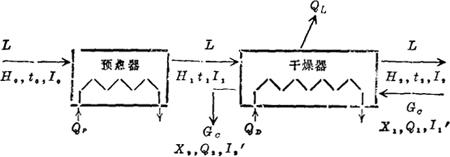 图16-8 连续干燥器的物料计算 GcX1+LH1=GCX2+LH2 式中 GC——绝干物料的质量流量(kg/s); L——绝干空气的流量(kg/s); H1,H2——分别为空气进、出干燥器时湿度(kg水/kg绝干气); X1,X2——分别为湿物料进、出干燥器时的干基含水量(kg水/kg绝干料)。 或 W=Gc(X1-X2)=L(H2-H1) 式中 l——单位空气消耗量(kg绝干气/kg水); W——水分蒸发量(kg水/s)。 2.热量衡算(图16-9)