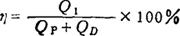 图16-9 干燥过程的热量计算 图16-9中,温度为t0、湿度为H0和焓为I0的新鲜空气,经预热送入干燥器;t1,H1,I1为预热后的状况;t2,H2和I2为空气离开干燥器的状况;绝干空气流量为L(kg/s);X1,X2为物料进出口干燥器时的干基含水量;θ1,θ2为其温度;I1′,I2′为焓;绝干物料的质量流量为Gc(kg/s);QP为预热器传热速率(kW);QD为干燥器中补充热量的速率(kW);QL为干燥器损失的速率(kW)。 干燥过程热量衡算的基本关系式 LIu+GCI1′+QP+QD=LI2+GCI2′+QL Q=QP+QD=L(I2-I0)+Gc(I2′-I1′)十OL 式中符号见图16-9。 3.干燥器的热效率