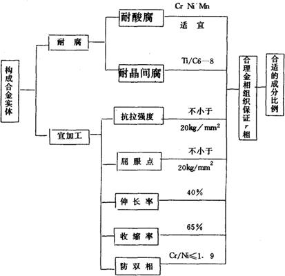 由上可知,1Cr18Ni9Ti的基本功能是耐腐和具有较好的机械加工性能。其功能系统图如图3所示。由功能系统图可知,影响1Cr18Ni9Ti基本功能的主要问题是合金的金相组织和与之相适应的化学元素的组成比例。因此,在冶炼过程中必须满足上述技术上的要求。