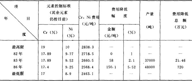四、方案评价 1.社会性评价。采用下限炼钢符合技术发展需要,也符合该厂发展不锈钢生产,降低成本,提高经济效益的需要。 2.经济性评价。实行下限炼钢方案,可控制Ni、Cr成份,降低成本。据计算,Cr、Ni用量每月各减少0.1%,每吨钢可降低成本5.96元和23.14元。仅此一项,83年增加盈利21万元,86年可增加盈利720万元。见表8。 表8 1C18Ni9Ti83、86两年度采用下限冶炼经济效益表