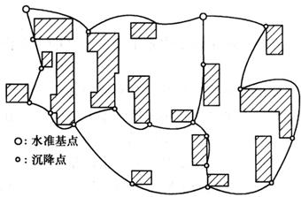| 释义 | 建筑物及深基坑垂直位移监测 建筑物及深基坑的垂直位移监测是采用精密水准测量的方法进行的,为此应建立高精度的水准测量控制网。其具体做法是:在建筑物的外围布设一条闭合水准环形路线,再由水准环中的固定点测定各测点的标高,这样每隔一定周期进行一次精密水准测量,将测量的外业成果进行严密平差,求出各水准点和沉降监测点的高程(最或然值)。某一沉降监测点的沉降量即为首次监测求得的高程与该次复测后求得的高程之差。 1.水准基点的布设及高精度水准网的建立 水准基点是固定不动且作为沉降监测高程基点的水准点。它是监测建筑物地基及深基坑变形的基准,一般设置3个水准点构成一组,在每组3个水准点的中心位置设置固定测站,测定3点间的高差,用以判断水准基点的高程本身有无变动。在布设时必须考虑下列因素: 1)根据监测精度的要求,应布置成网形最合理、测站数最少的监测环路。如图10-50所示为某建筑场区水准网的布设。