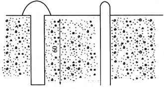 图10-50 水准网的布设 2)在整个水准网里,应有4个埋设深度足够的水准基点作为高程起算点,其余的可埋设一般地下水准点或墙上水准点。施测时可选择一些稳定性较好的沉降点,作为水准线路基点与水准网统一监测和平差。因为施测时不可能将所有的沉降点均纳入水准线路内,大部分沉降点只能采用安置一次仪器直接测定,因为转站会影响成果精度,所以,选择一些沉降点作为水准基点极为重要。 3)水准基点应根据建筑场区的现场情况,设置在较明显而且通视良好、安全的地方,且要求便于进行联测。 4)水准基点应布设在拟监测的建筑物之间,距离一般为20~40m,一般工业与民用建筑物应不小于15m,较大型并略有振动的工业建筑物应不小于25m,高层建筑物应不小于30m。总之,应埋设在建筑物变形影响范围之外、不受施工影响的地方。 5)监测单独建筑物时,至少布设3个水准基点,对建筑面积大于5000m2或高层建筑,则应适当增加水准基点的个数。 6)一般水准基点应埋设在冻土线以下0.5m处,设在墙上的水准基点应埋在永久性建筑物上,且离开地面高度约为0.5m。 7)水准基点的标志构造,必须根据埋设地区的地质条件、气候情况及工程的重要程度进行设计。对于一般建筑物及深基坑沉降监测,可参照水准测量规范中二、三等水准的规定进行标志设计与埋设;对于高精度的变形监测,需设计和选择专门的水准基点标志。 2.沉降监测点的布设 沉降监测点是设立在变形体上、能反映其变形特征的点。沉降监测布设的监测点的位置及数量,应根据建(构)筑物荷载大小、基础形式、结构特征及地质条件以及支护结构形式、基坑周边环境等因素确定。一般可根据下列几方面布设: 1)监测点应布置在深基坑及建筑物本身沉降变化较显着的地方,并要考虑到在施工期间和竣工后能顺利进行监测的地方。 2)深基坑支护结构的沉降监测点应埋设在锁口梁上,一般间距10~15m埋设一点,在支护结构的阳角处和原有建筑物离基坑很近处应加密设置监测点。 3)在建筑物四周角点、中点及内部承重墙(柱)上均需埋设监测点,并应沿房屋周长每间隔10~12m设置一个监测点,但工业厂房的每根柱子均应埋设监测点。 4)由于相邻建筑及深基坑与周边环境之间相互影响的关系,在高层和低层建筑物、新老建筑物连接处,以及在相接处的两边都应布设监测点。 5)在人工加固地基与天然地基交接和基础砌筑深度相差悬殊处,以及在相接处的两边都应布设监测点。 6)当基础形式不同时,需在结构变化位置埋设监测点。当地基土质不均匀,可压缩性土层的厚度变化不一或有暗浜等情况时需适当埋设监测点。 7)在振动中心基础上也要布设监测点,对烟囱等刚性整体基础,应不少于3个监测点。 8)当宽度大于15m的建筑物在设置内墙体的监测标志时,应设在承重墙上,并且要尽可能布置在建筑物的纵横轴线上,监测标志上方应有一定的空间,以保证测尺直立。 9)重型设备基础的四周及邻近堆置重物之处,有大面积堆荷的地方,也应布设监测点。 沉降监测点应埋设在稳固,不易被破坏,能长期保存的地方。其埋设点的标高位置,一般在室外地坪+0.500m较为适宜,但在布置时应根据建筑物层高、管道标高、室内走廊、平顶标高等情况来综合考虑。点的高度、朝向等要便于立尺和监测。同时还应注意所埋设的监测点要避开柱子间的横隔墙、外墙上的雨水管等,以免所埋设的监测点无法监测而影响监测资料的完整性。 设备基础、支护结构锁口梁上的监测点,可将直径20mm的铆钉或钢筋头(上部锉成半球状)埋设于混凝土中作为标志(图10-51)。墙体上或柱子上的监测点,可将直径20~22mm的钢筋按图10-52的形式设置。