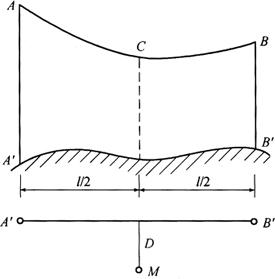图15-9 平行四边形法放样弛度 2.中点天顶距法 如图15-10所示,在档距中垂线上适当位置架设经纬仪,使竖盘安置在预定的读数上,通过望远镜进行观测。设测站M的地面高程为Hm,仪器高为i,而测站至导线中点C的平距为D,根据垂弧和高差公式可算得天顶距为