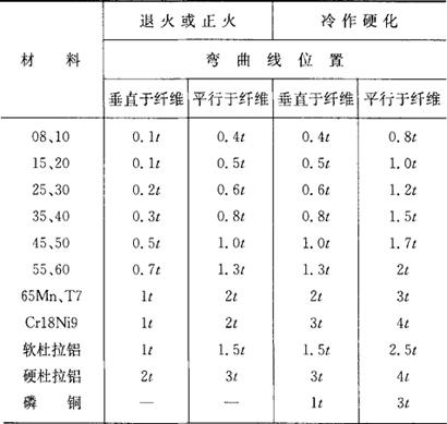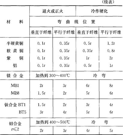 | 释义 | 弯曲模设计 (一)弯曲件的工艺性 1.最小弯曲半径 弯曲件的圆角半径不宜过大和过小。过大时因受回弹的影响,弯曲件的精度不易保证;过小时弯曲半径处容易产生裂纹。各种材料的最小弯曲半径见表1.2-45,弯曲件的内弯曲半径必须大于表中所列的数值。 表1.2-45 最小弯曲半径 (mm)