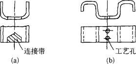 图1.2-29 弯曲毛坯的工艺切口 5.连接带和定位工艺孔 在弯曲区附近有缺口的弯曲件,若在毛坯上将缺口先冲出,弯曲时会出现“叉口”现象,不能保证工件质量要求。因此,缺口处应留有连接带,待弯成后,再将缺口处多余部分切除(图1.2-30a)。