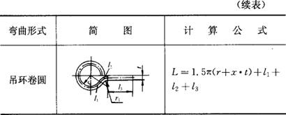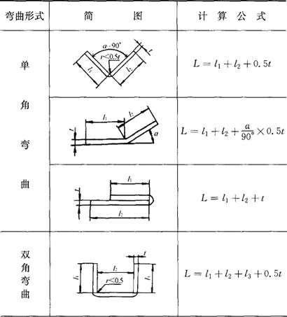 (三)弯曲件毛坯展开长度的计算 弯曲件的毛坯长度,是根据应变中性层在弯曲前后长度不变的原则来计算的。 (1)弯曲半径r<0.5t时,毛坯展开长度的计算(表1.2-48)。 表1.2-48 在r<0.5t的弯曲中,求毛坯展开长度的公式