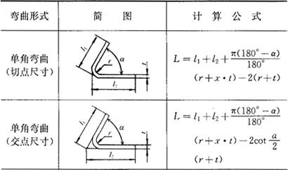 (2)弯曲半径r>0.5t时,毛坯展开长度的计算(表1.2-49)。 表1.2-49 在r>0.5t的弯曲中,求毛坯展开长度的公式