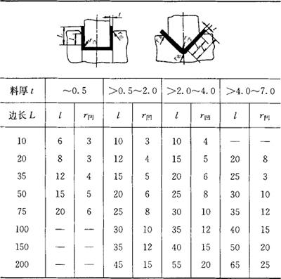 表中 b凸、b凹——弯曲凸、凹模宽度尺寸,[b凸、b凹]为mm; c——弯曲凸、凹模单边间隙,[c]为mm; L——弯曲件外形或内形的基本尺寸,[L]为mm; △——弯曲件的尺寸偏差,[△]为mm; δ凸、δ凹——弯曲凸、凹模制造公差,采用IT7~IT9级。 (2)凸、凹模的圆角半径与弯曲凹模深度的确定 ①凸模圆角半径。若弯曲件的内侧弯曲半径为r,则应取r凸=r,但不能少于材料允许的最小弯曲半径rmin。如因工件结构上的需要,出现r<rmin时,则应取r凸>rmin,然后增加一次整形工序,使整形模的r凸=r。 ②凹模圆角半径与凹模深度(表1.2-54)。 表1.2-54 凹模圆角半径与凹模深度 (mm)