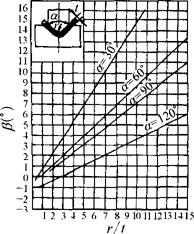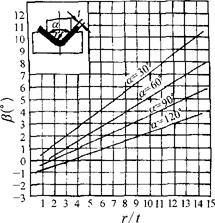 图1.2-34 08号~10号钢在弯曲时的回弹角β α=30°时,β=0.75r/t-0.39 α=60°时,β=0.58r/t-0.80 α=90°时,β=0.43r/t-0.61 α=120°时,β=0.36r/t-1.26