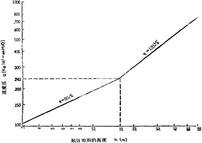 式中 P——风压(kg/m2=mmH2O); q——速度压(kg/m2=mmH2O); h——起自地面的高度(m); ξ——风力系数(-)。 各种建筑物受到的风压如图3-139~图3-142所示。